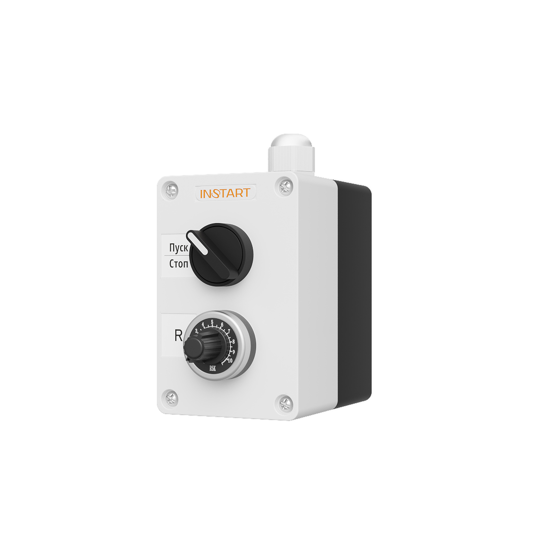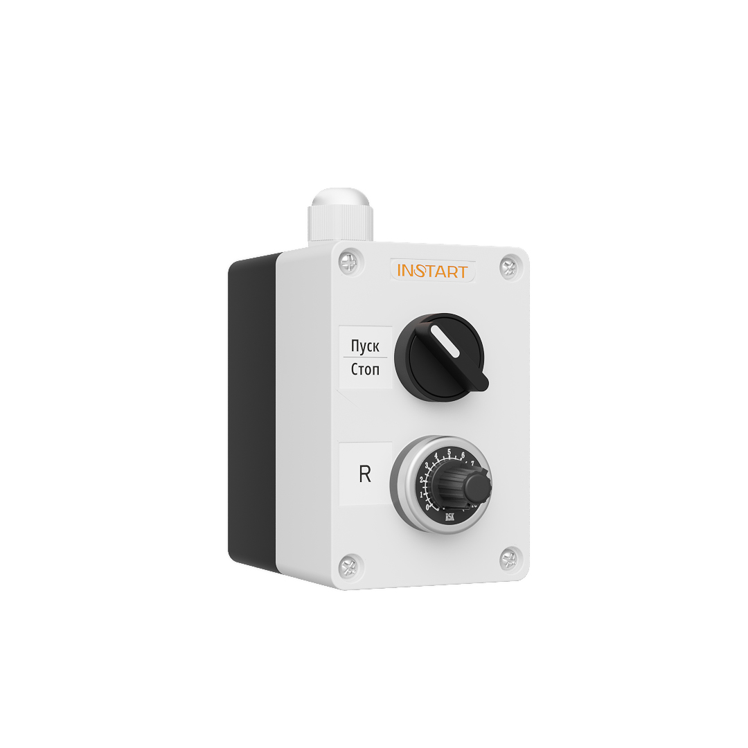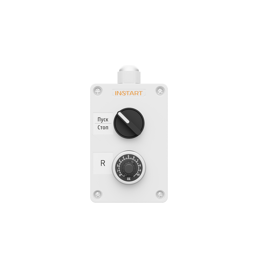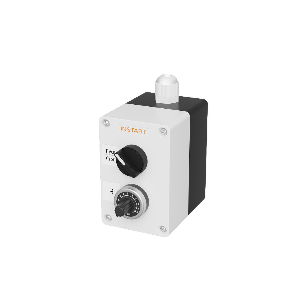 ПУ-2-011 – пульт управления, оснащённый 2-х позиционным переключателем и потенциометром. Предназначен для управления пуском, остановом, изменения опорного сигнала частоты.