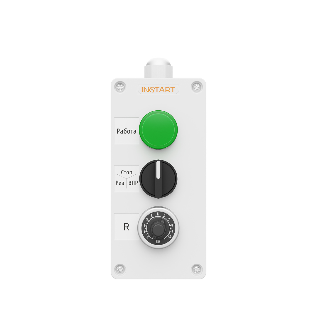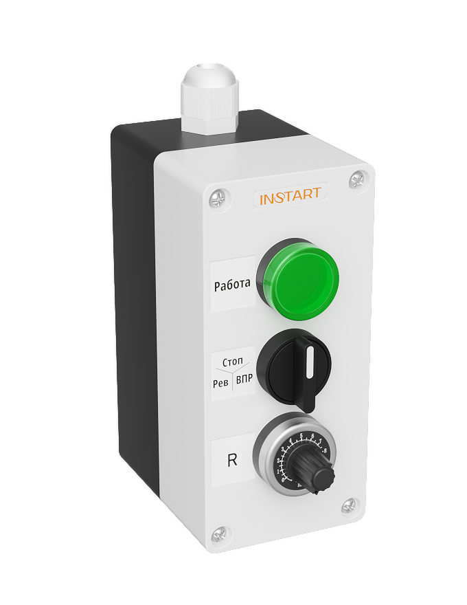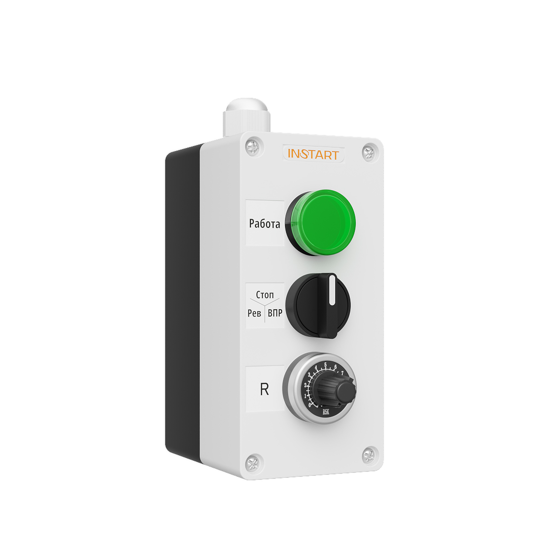 ПУ-3-121 – пульт управления, оснащённый индикацией, в виде зелёной лампы 24 В, 3-х позиционным переключателем, потенциометром. Предназначен для управления пуском, остановом, направлением вращения, изменения опорного сигнала частоты, индикации работы преобразователя частоты.
