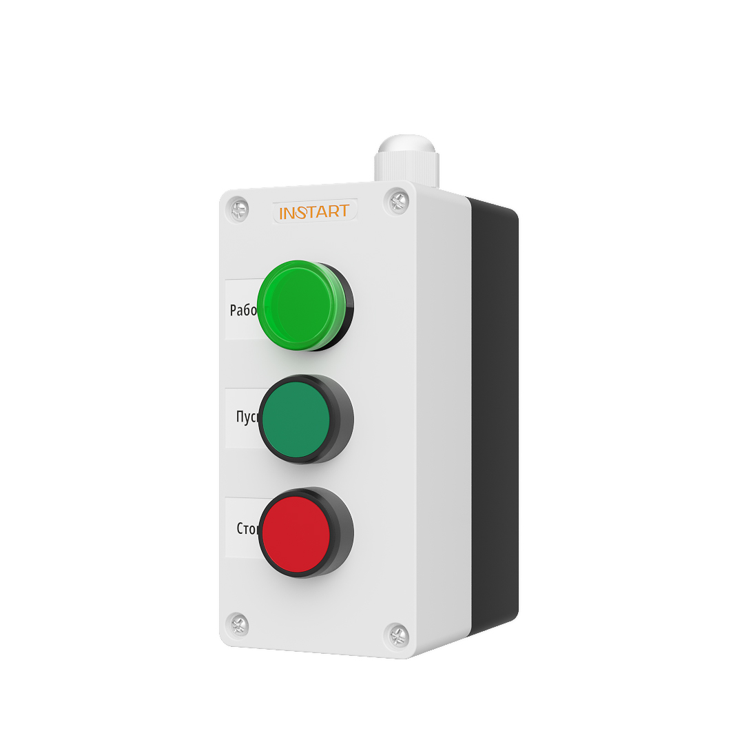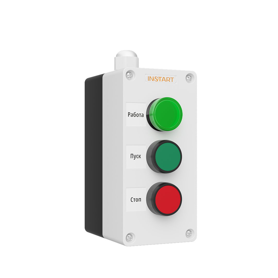 ПУ-3-230 – пульт управления, оснащённый кнопками пуск, стоп и индикацией, в виде зелёной лампы 220В. Предназначен для управления пуском, остановом электродвигателя, индикации работы преобразователя частоты.