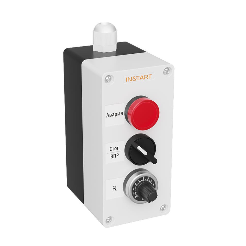 ПУ-3-511 – пульт управления, оснащённый индикацией, в виде красной лампы 220В, 2-х позиционным переключателем, потенциометром. Предназначен для управления пуском, остановом, изменения опорного сигнала частоты, индикации аварии преобразователя частоты.