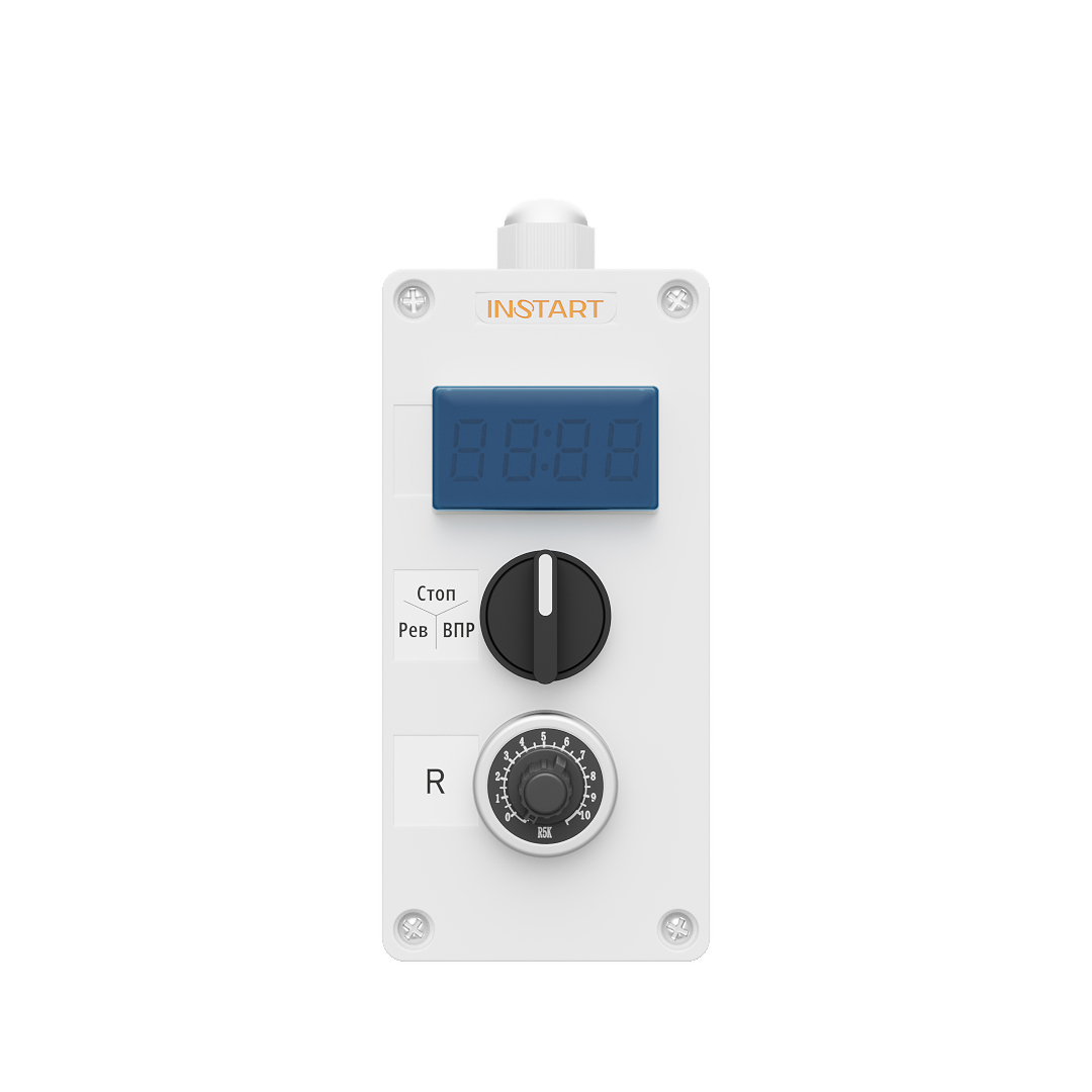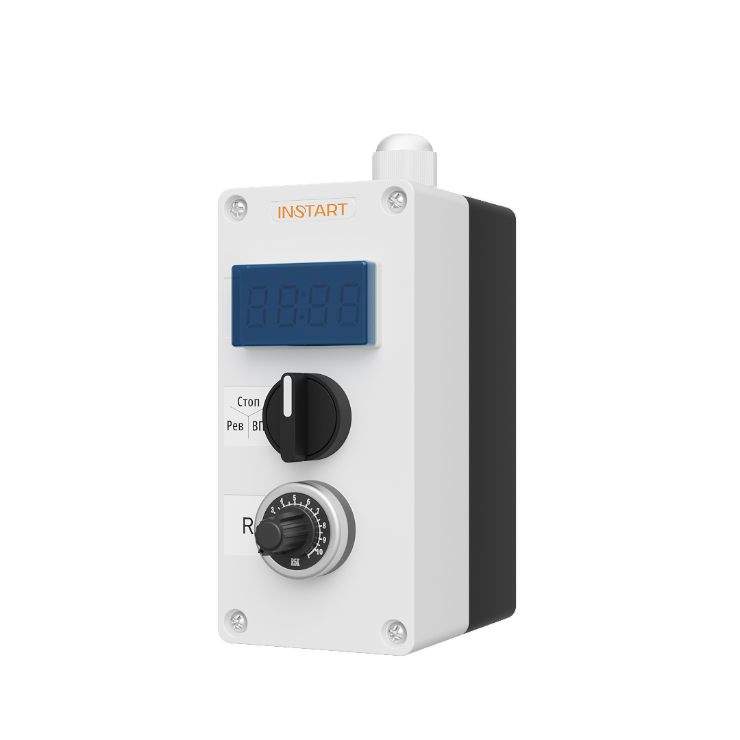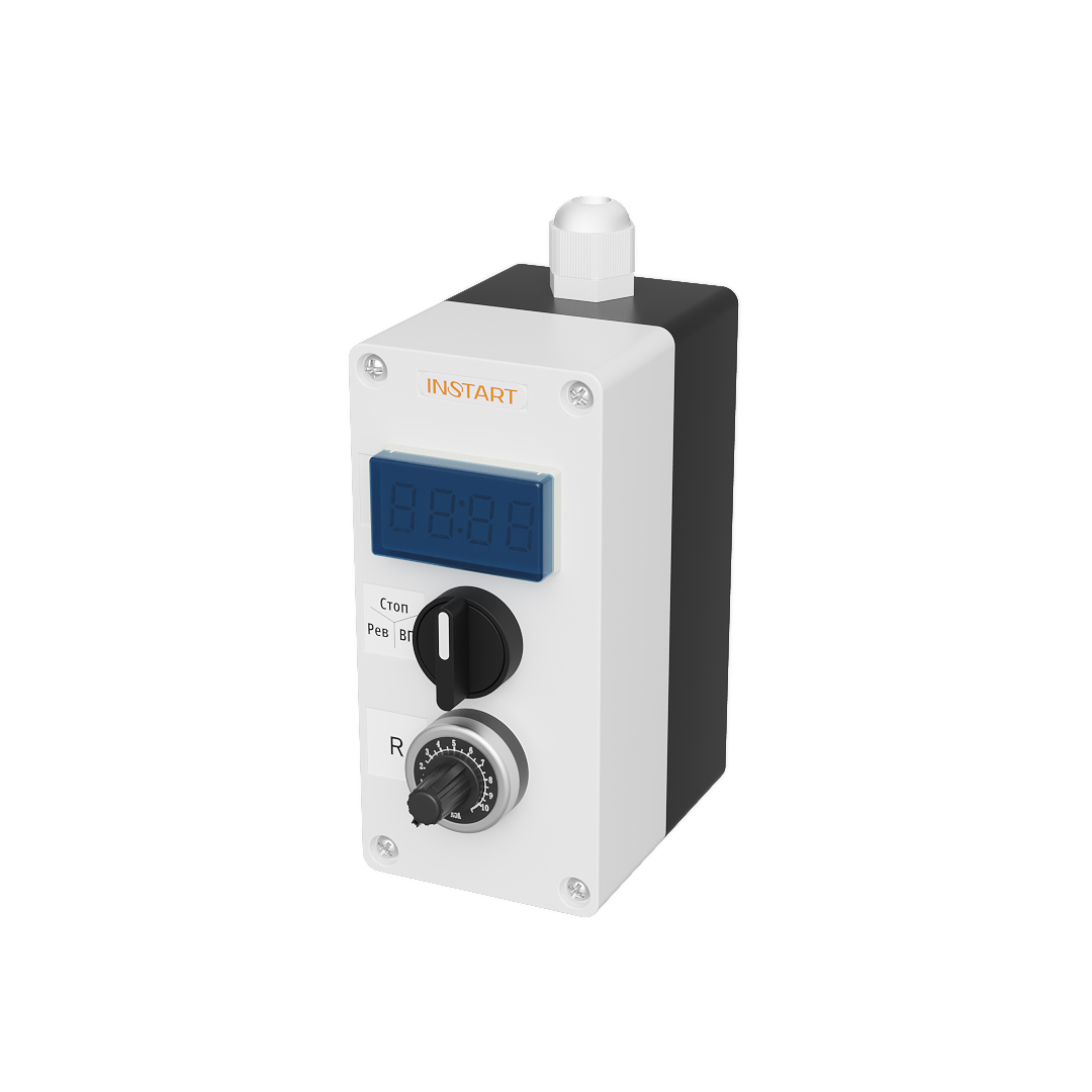 ПУ-3-621 – пульт управления, оснащённый измерителем аналоговых сигналов, 3-х позиционным переключателем, потенциометром. Предназначен для управления пуском, остановом, направлением вращения, изменения опорного сигнала частоты и отображения требуемых показателей.