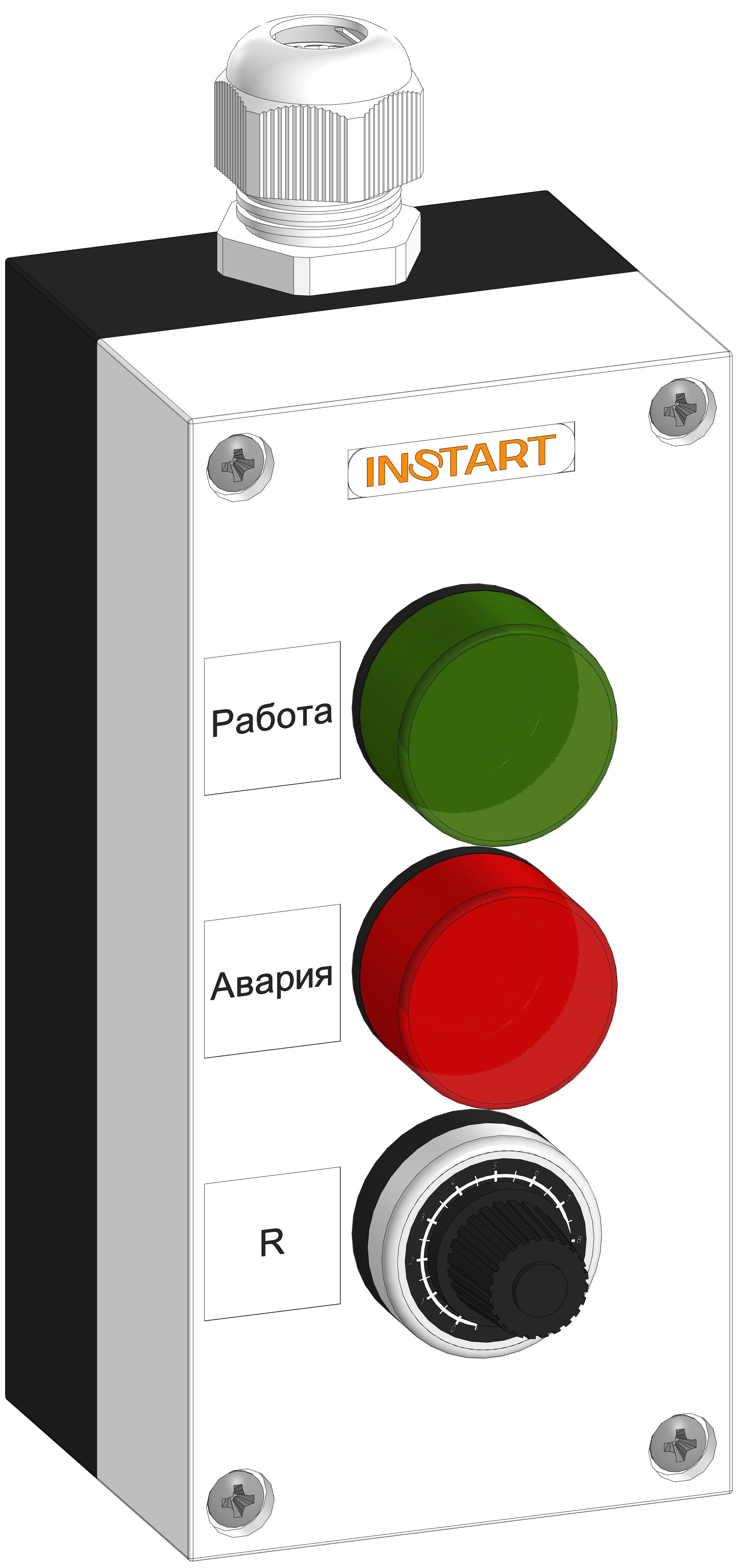 ПУ-3-701 – пульт управления, оснащённый индикацией в виде красной и зеленой лампы 24 В и потенциометром. Предназначен для индикации работы и аварии преобразователя частоты и изменения опорного сигнала частоты.