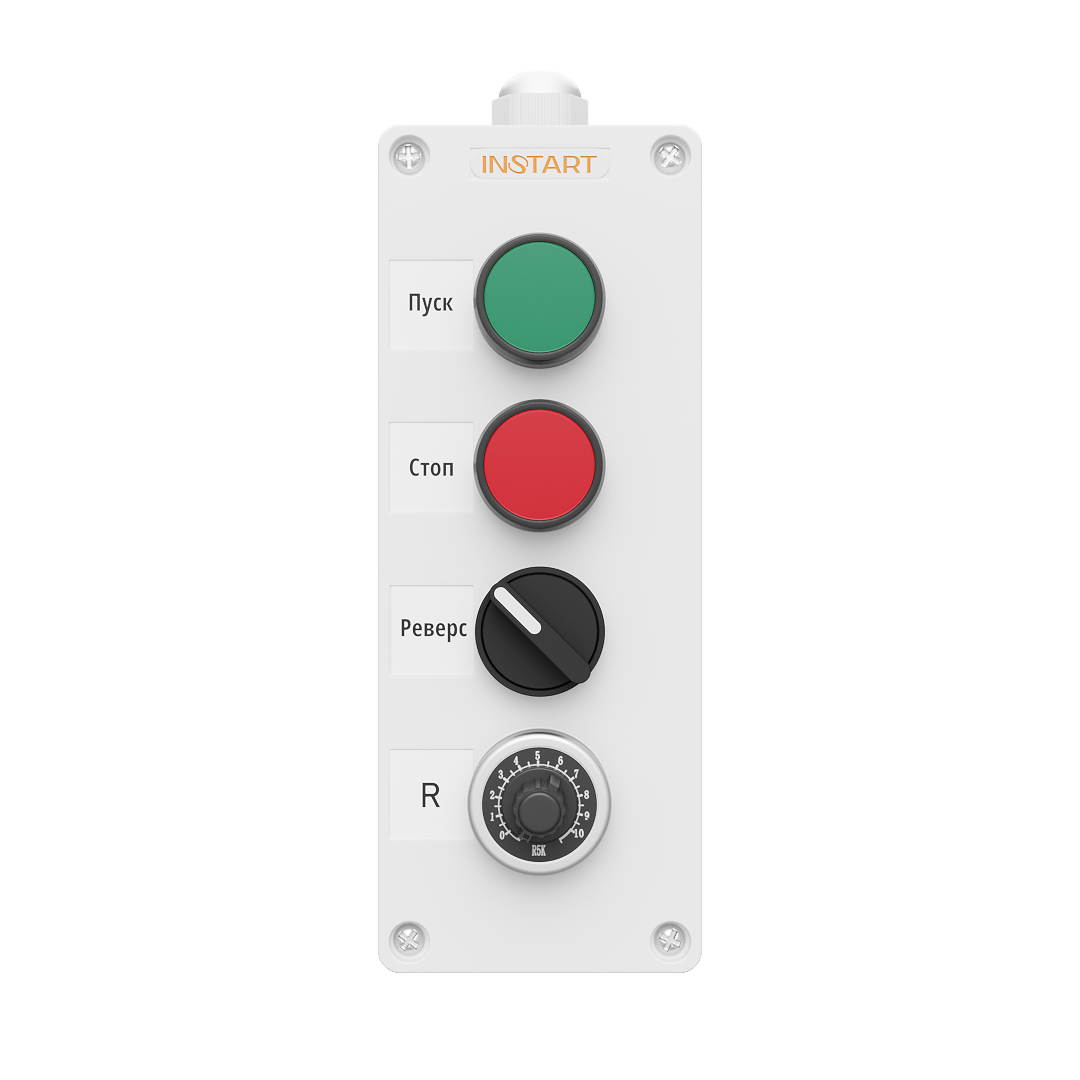 ПУ-4-041 – Пульт управления оснащён потенциометрам, кнопками пуск, стоп, 2-ух позиционным переключателем. Предназначен для управления пуском, остановом, направлением и скоростью вращения электродвигателя.