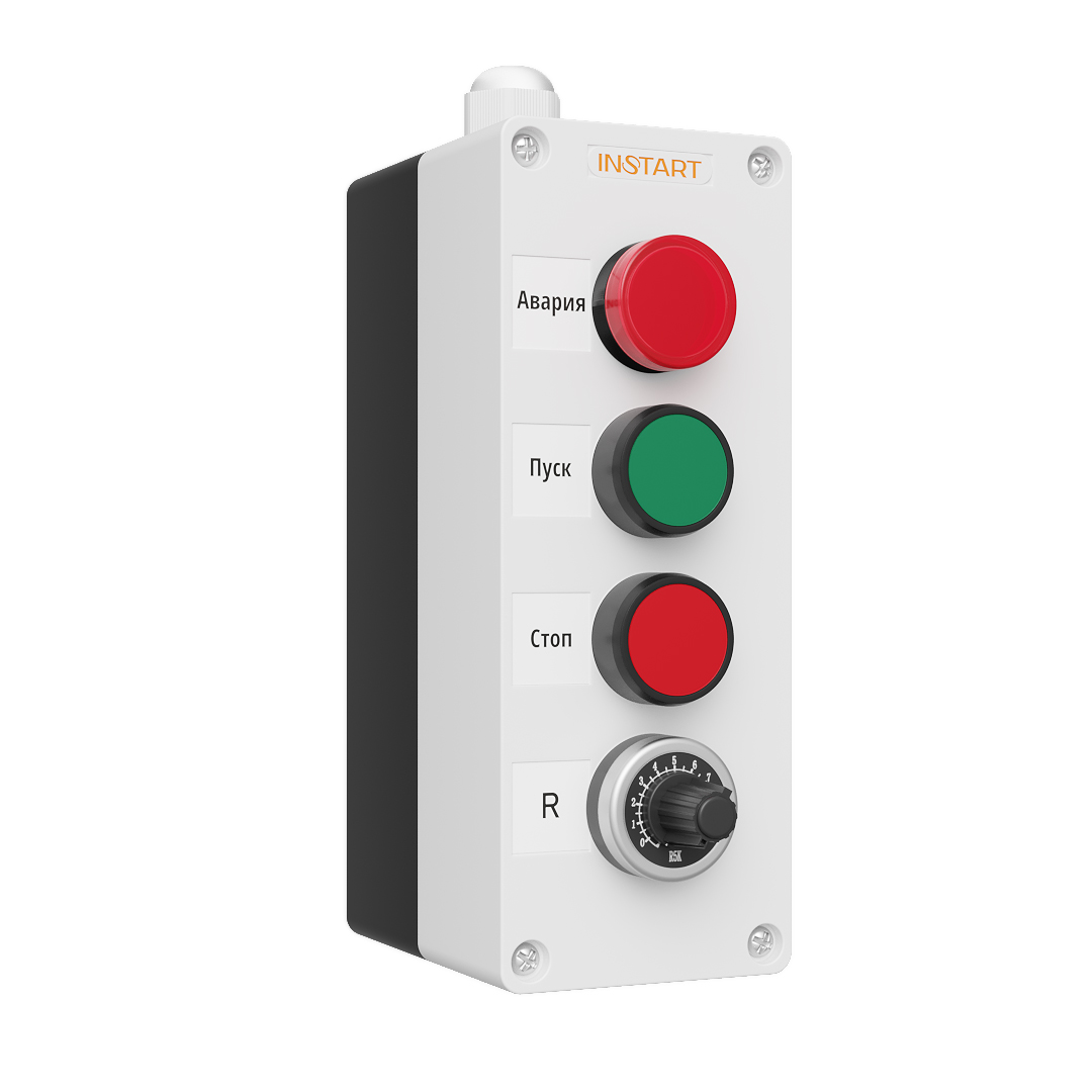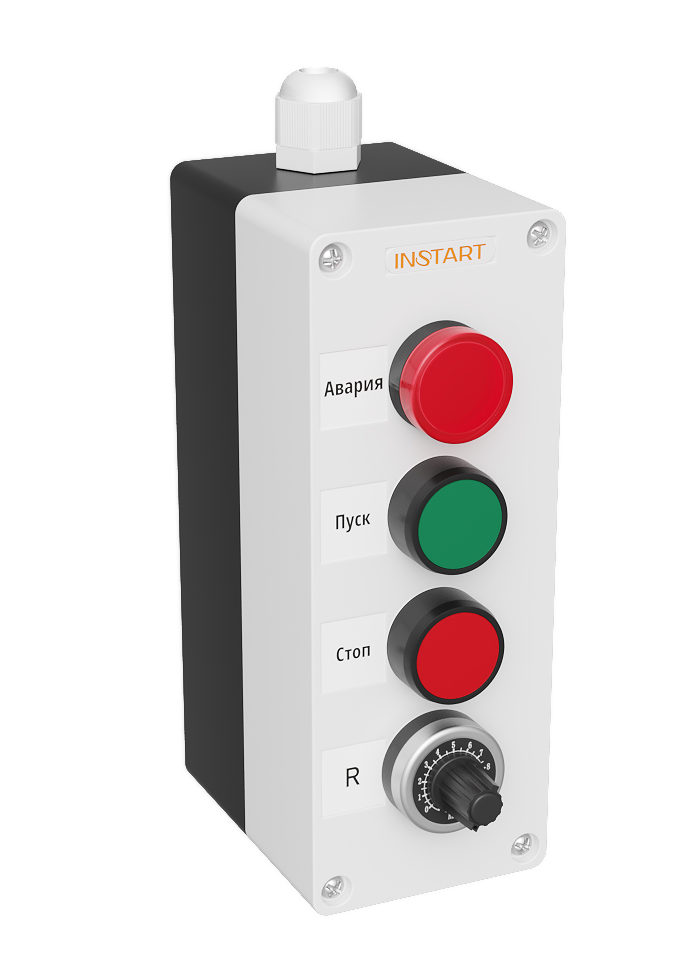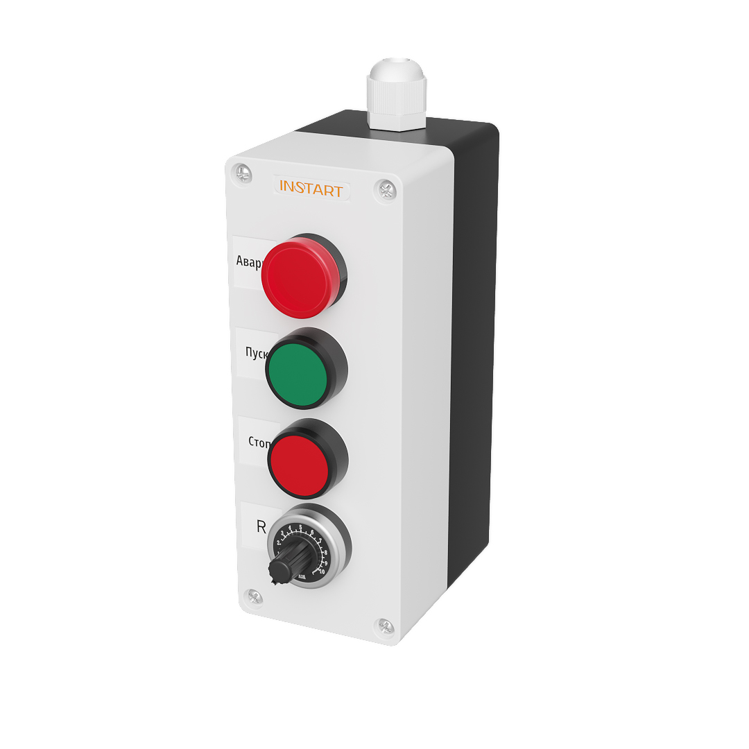 ПУ-4-431 – пульт управления, оснащённый индикацией в виде красной лампы 24В, кнопками пуск/стоп и потенциометром. Предназначен для управления пуском, остановом, изменения опорного сигнала частоты, индикации аварии преобразователя частоты.
