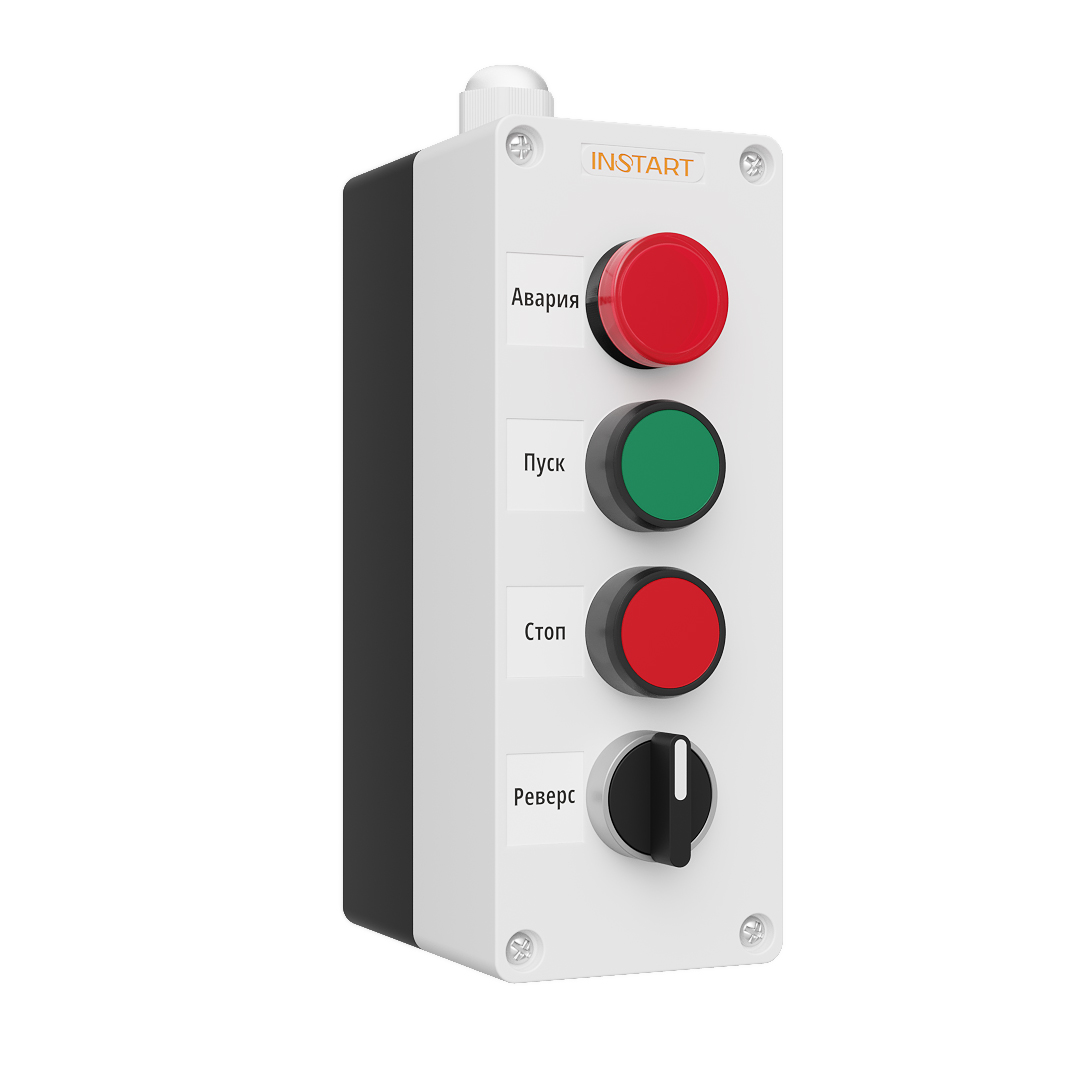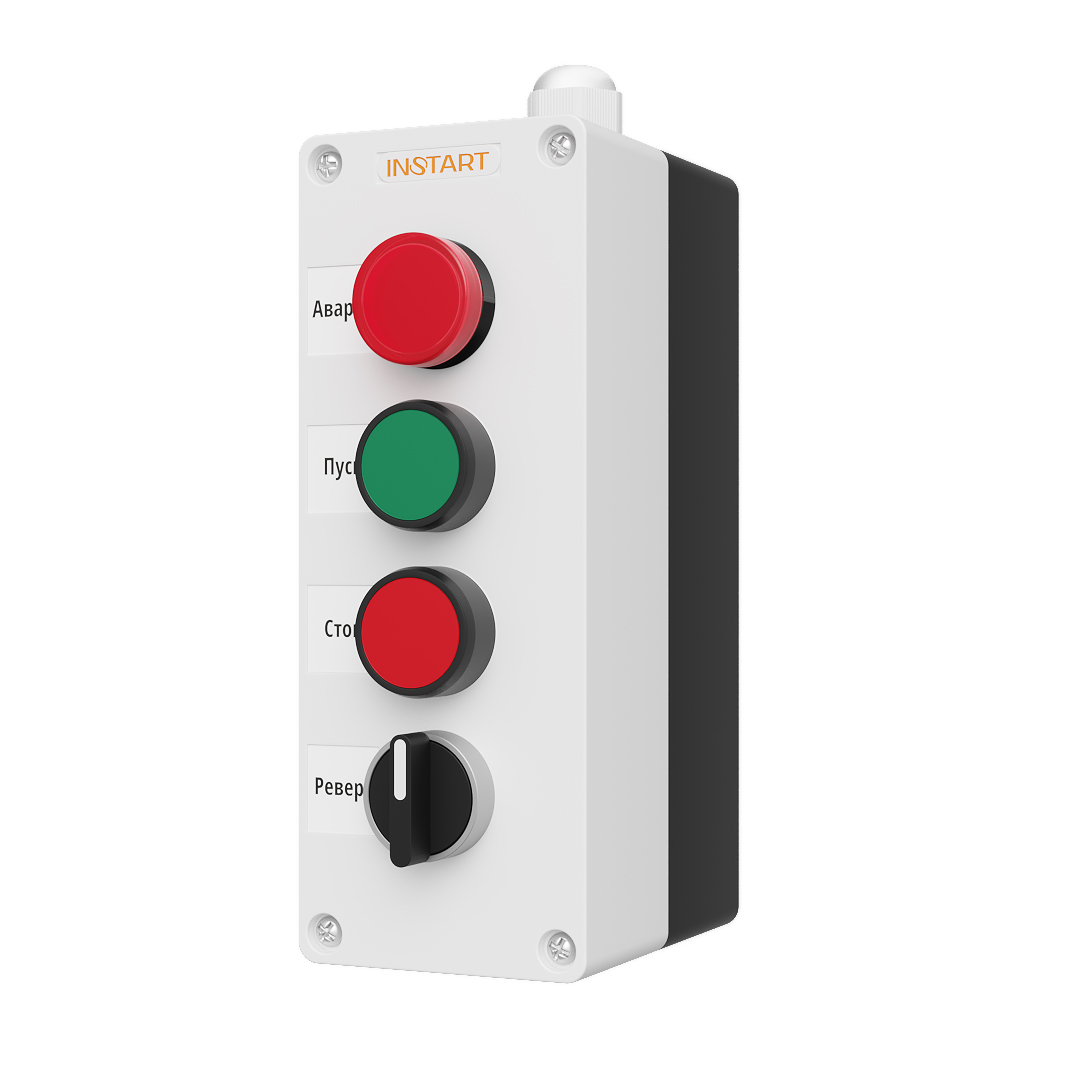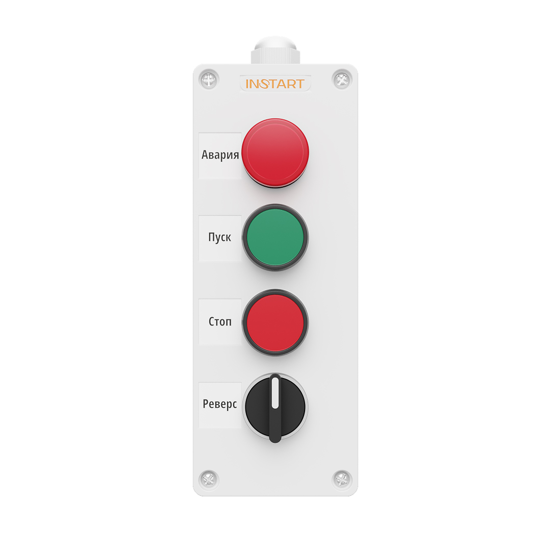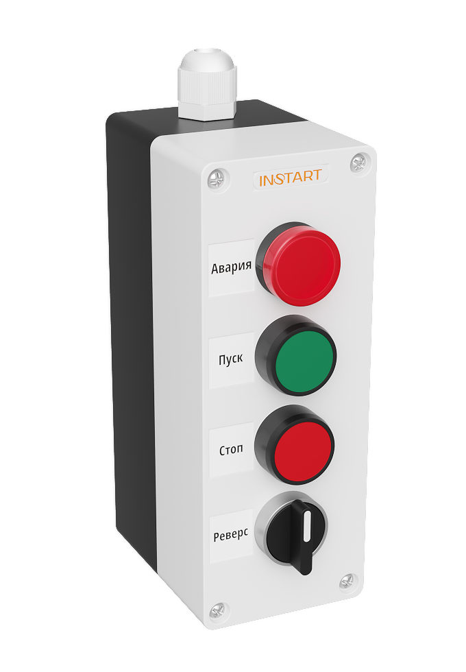 ПУ-4-440 – пульт управления, оснащённый индикацией в виде красной лампы 24В, кнопками пуск/стоп, 2-х позиционным переключателем. Предназначен для управления пуском остановом, направлением вращения электродвигателя и индикации аварии преобразователя частоты.