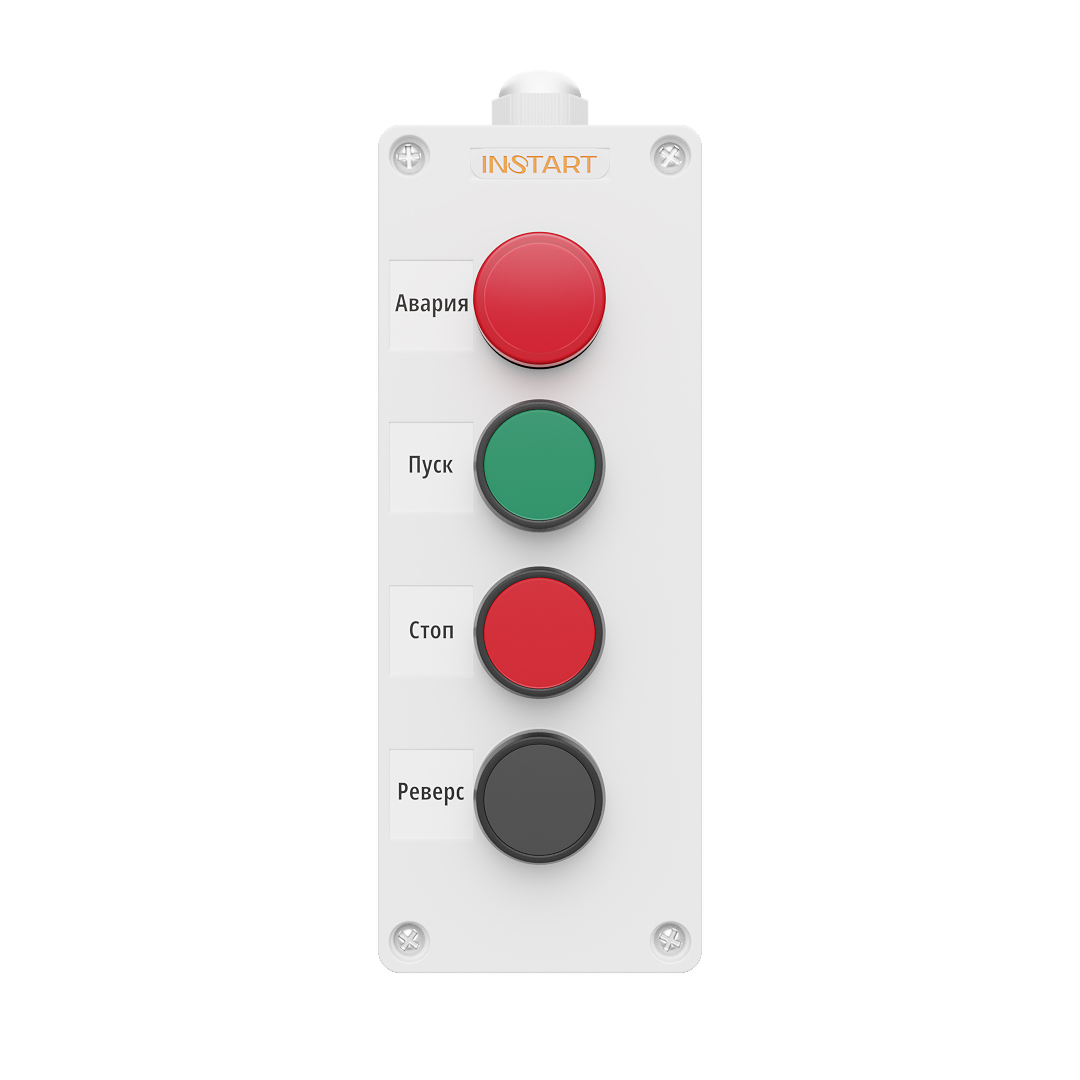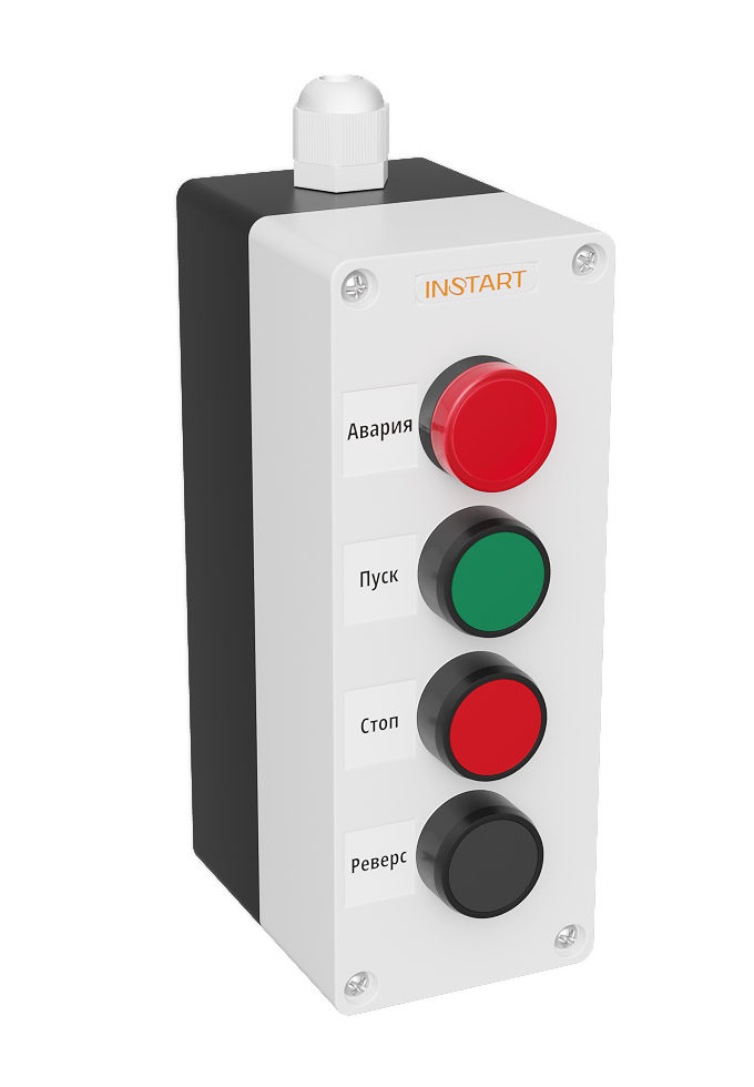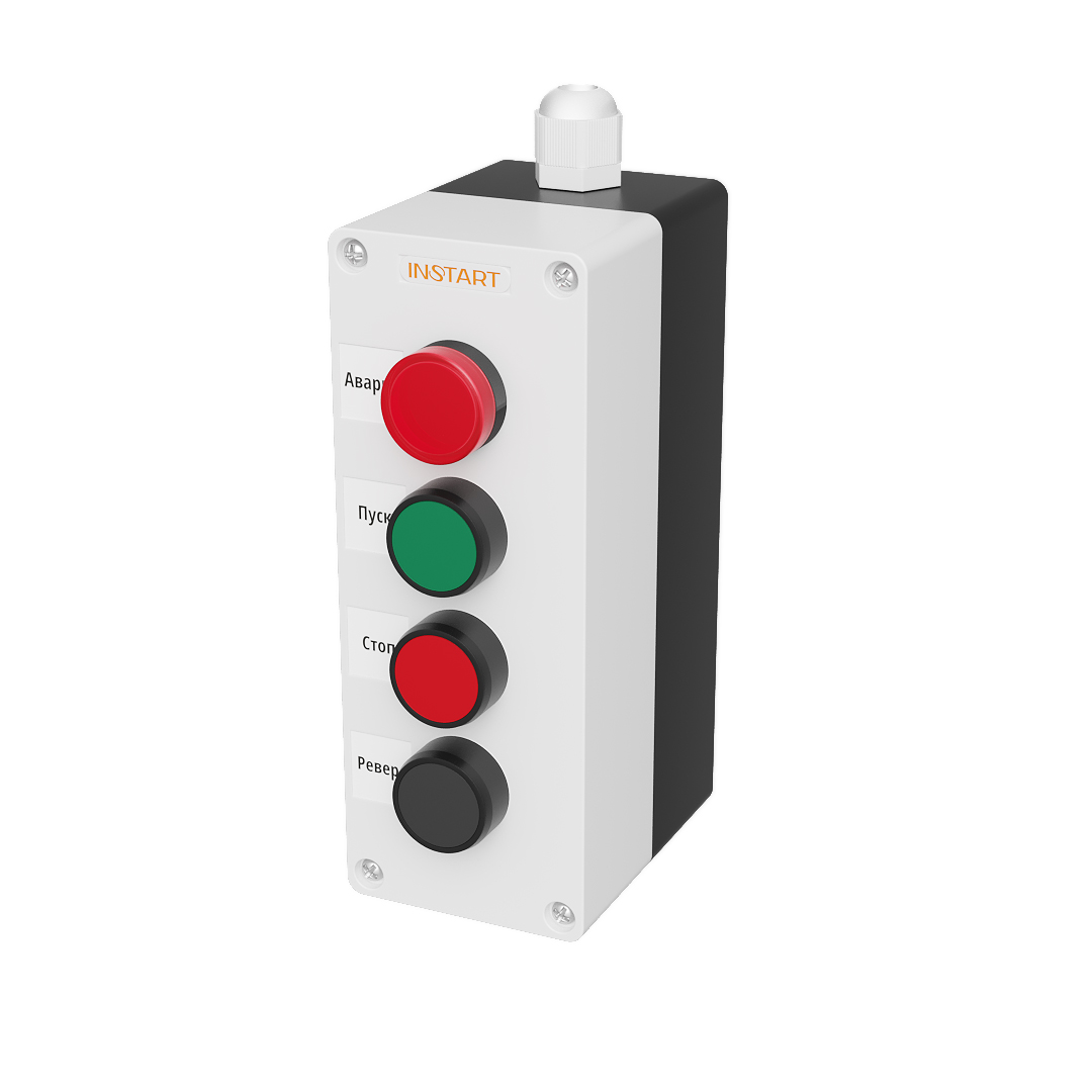 ПУ-4-450 – пульт управления, оснащённый индикацией в виде красной лампы 24В, кнопками пуск/стоп/реверс. Предназначен для управления пуском остановом, направлением вращения электродвигателя, индикации аварии преобразователя частоты.