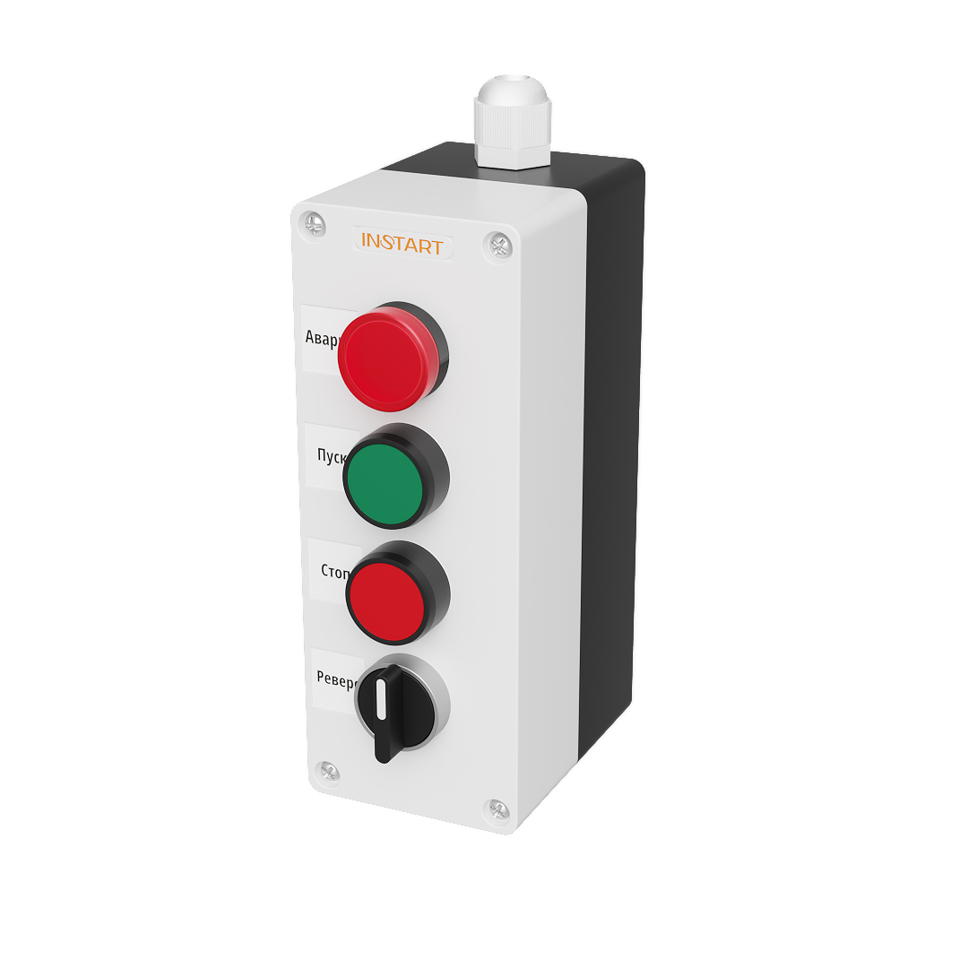 ПУ-4-540 – пульт управления, оснащённый индикацией в виде красной лампы 220В, кнопками пуск/стоп, 2-х позиционным переключателем. Предназначен для управления пуском остановом, направлением вращения электродвигателя, индикации аварии преобразователя частоты.